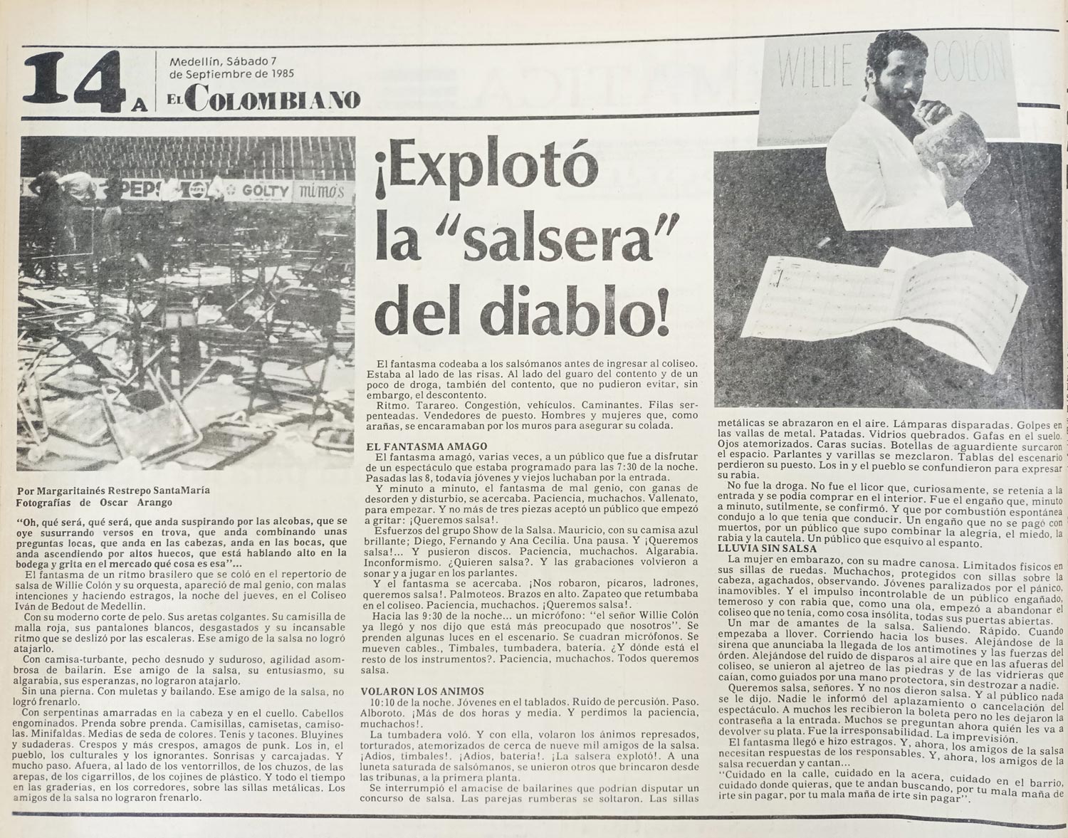 La periodista de El Colombiano afirma que a la salida del coliseo, bordeando la medianoche, empezaba a llover, mientras la gente abandonaba el lugar “corriendo hacia los buses, alejándose de la sirena que anunciaba la llegada de los antimotines y las fuerzas del orden, alejándose del ruido de disparos al aire…”. Entre ellos quizás iba la sombra del tipo aquel que nadie sabe quién es ni dónde está, pero que muchos aseguran haber visto con una conga marcada con el nombre de Willie Colón debajo del brazo. O en la cabeza, quién sabe, para protegerse de las primeras gotas de lluvia.