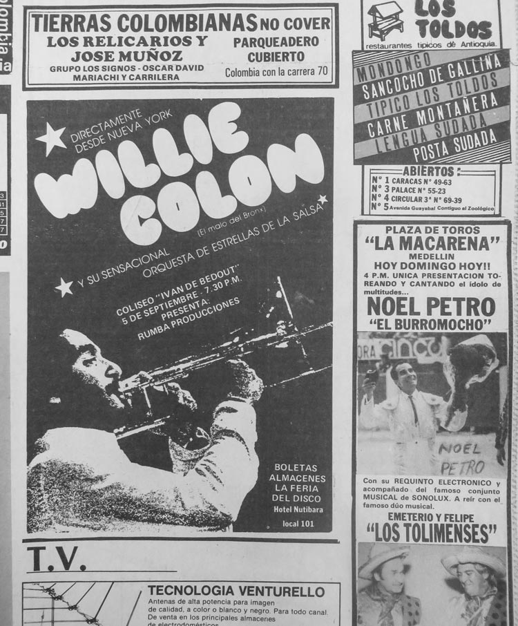 La que fue la primera visita de Willie Colón y su orquesta a Medellín, hace cuarenta años, está llena de especulaciones y mitos, datos por confirmar, historias que en el fondo lo que tratan es de hacer a cada uno de sus testigos dueño de una verdad, la que sea, aunque no lo sea.
