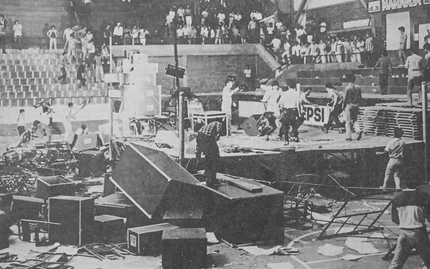Poco a poco los gritos de “¡Queremos salsa!” fueron cambiando por los de “¡Ladrones! ¡Pícaros!”. Medios y asistentes coinciden al señalar las 10:10 p. m. como la hora llegada. En ese instante empezó el lanzamiento de botellas desde las tribunas y de sillas metálicas desde la pista. Todos los objetos apuntaban al escenario. En cuestión de segundos grupos de muchachos derribaron las portentosas torres de sonido y enseguida arremetieron contra instrumentos y partituras ya dispuestos en la tarima.