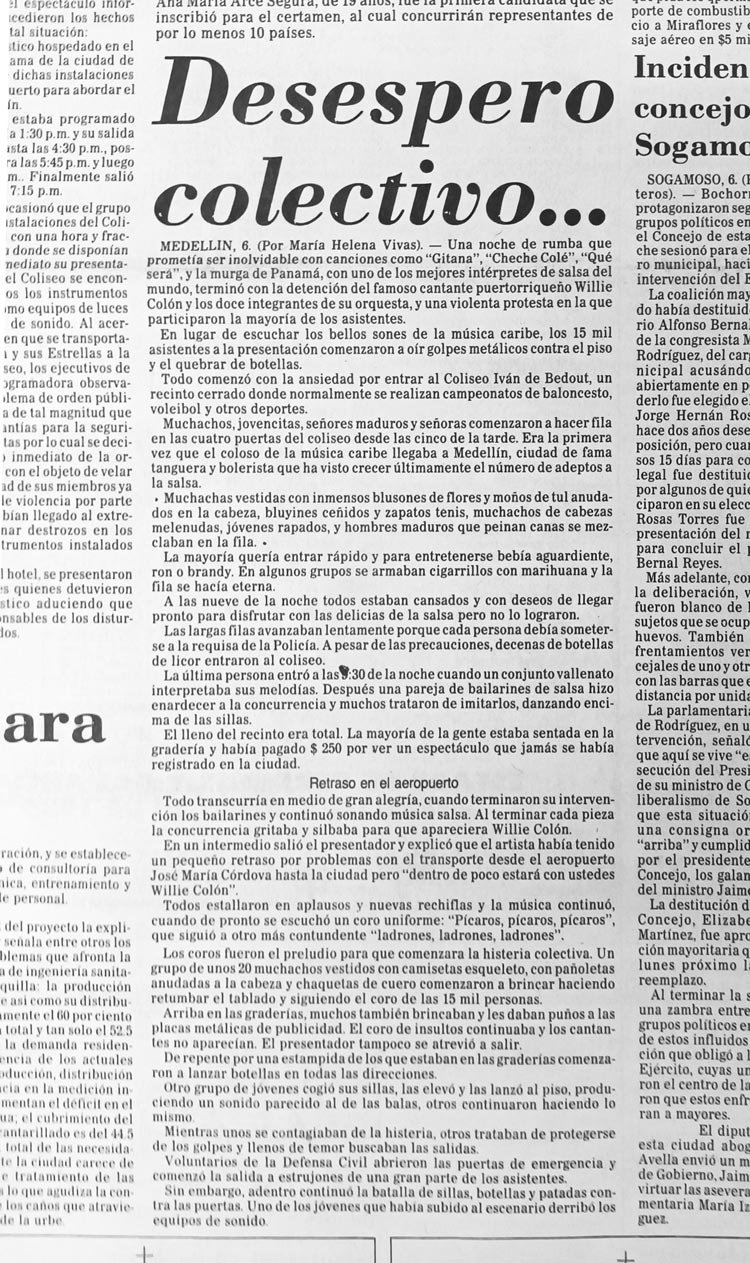 Sobre las razones para la ausencia de Willie Colón, quien nunca llegó a subirse a la tarima en el coliseo, especulan algunos que en el Hotel Nutibara, adonde llegó a hospedarse, conoció a una bella señorita que también era huésped, se encerró con ella en una habitación y se le olvidó el compromiso. Se dijo también, algunos lo sostienen todavía, que se quedó en Bogotá en una fiesta con mafiosos, trago y coca. Sin embargo, si nos atenemos a lo publicado por la prensa regional y nacional, donde se registran las diferentes versiones, el cantante y los miembros de su orquesta llegaron a Medellín, sí, pero no a tiempo para presentarse al concierto convocado para las siete y media de la noche, sino dos horas después, cuando ya en el Iván de Bedout estaban a punto volar botellas de aguardiente por el aire. El retraso en el vuelo desde Bogotá al recién inaugurado José María Córdova fue el culpable: programado para el mediodía, el avión de SAM donde venían los músicos apenas vino a despegar a las 7:15 p. m.