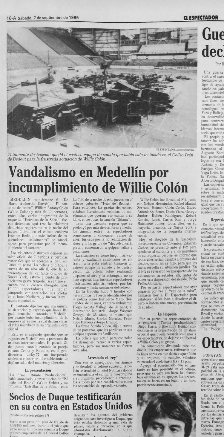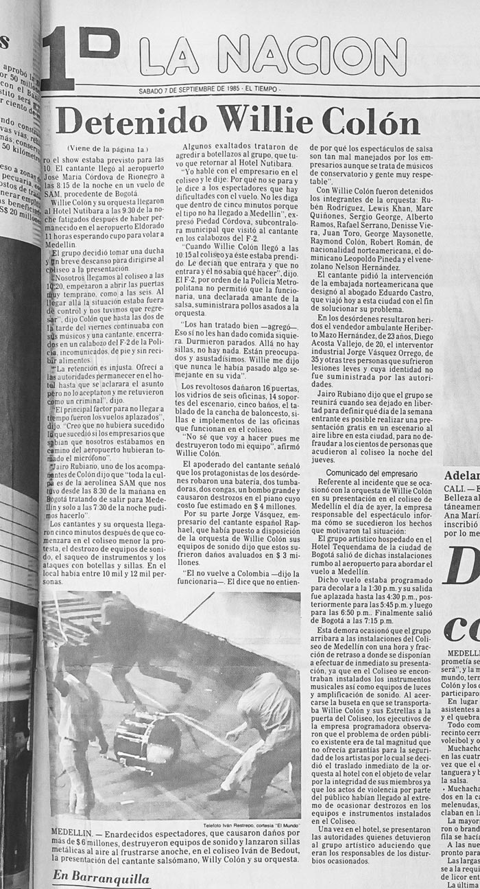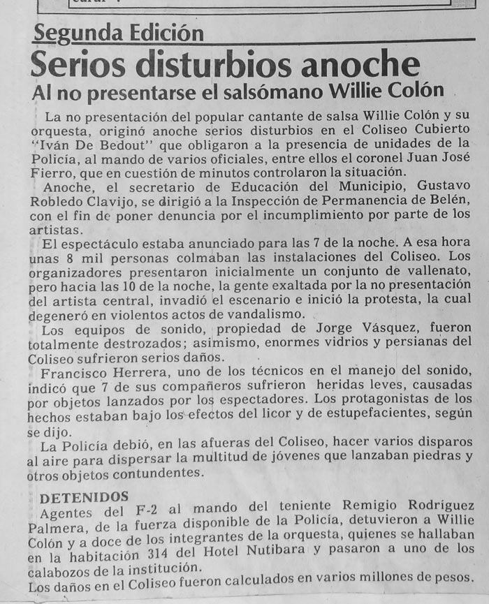 Aquel jueves, Willie Colón y sus estrellas llegaron al Hotel Nutibara a las nueve y media de la noche, muy cansados, según informaron después, se dieron un respiro, posiblemente una ducha —minutos valiosos en acicalamiento— y salieron. Eran las 10:20 p. m. cuando arribaron al coliseo, pero ni se bajaron del carro. “La policía lo enteró de lo que estaba pasando adentro y no le permitió entrar. Junto con sus músicos se devolvió para el hotel”, informó El Mundo el sábado 7 de septiembre. Una hora después, a las once y treinta, llegaron al hotel veinte uniformados, según El Tiempo, que detuvieron a Willie y sus trece acompañantes (en otros medios se habla de once, pero el diario bogotano enlista trece nombres) y se los llevaron para el F2 en Belén. La orden la dio el coronel Miguel Carrillo García, comandante de la policía metropolitana. Los cargos: incumplimiento y estafa.