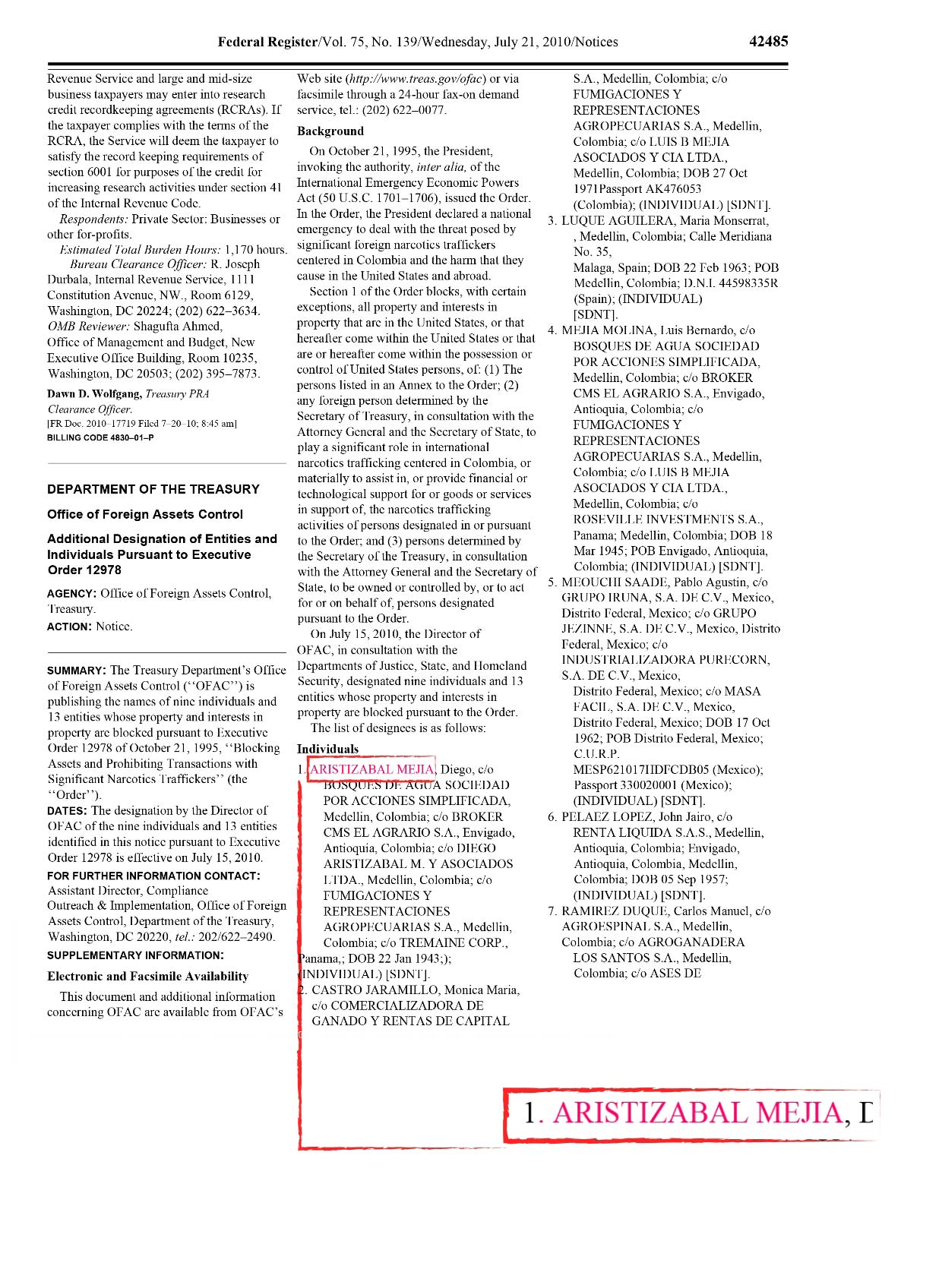 Diego Aristizábal Mejía, de 62 años en ese momento, compró el 4,6 % de la finca. Aristizábal fue incluido por el Departamento del Tesoro de Estados Unidos en la lista de negocios y personas asociados al narcotráfico, la Lista Clinton, entre 2010 y 2018, por pertenecer a la estructura criminal del narcotraficante Pedro Antonio Bermúdez Suaza, alias El Arquitecto, piloto de Pablo Escobar y socio de Joaquín ‘El Chapo’ Guzmán. En 1981 Aristizábal también fue miembro de la junta directiva de Confirmesa, empresa involucrada en el asesinato de Guillermo Cano, director de El Espectador.