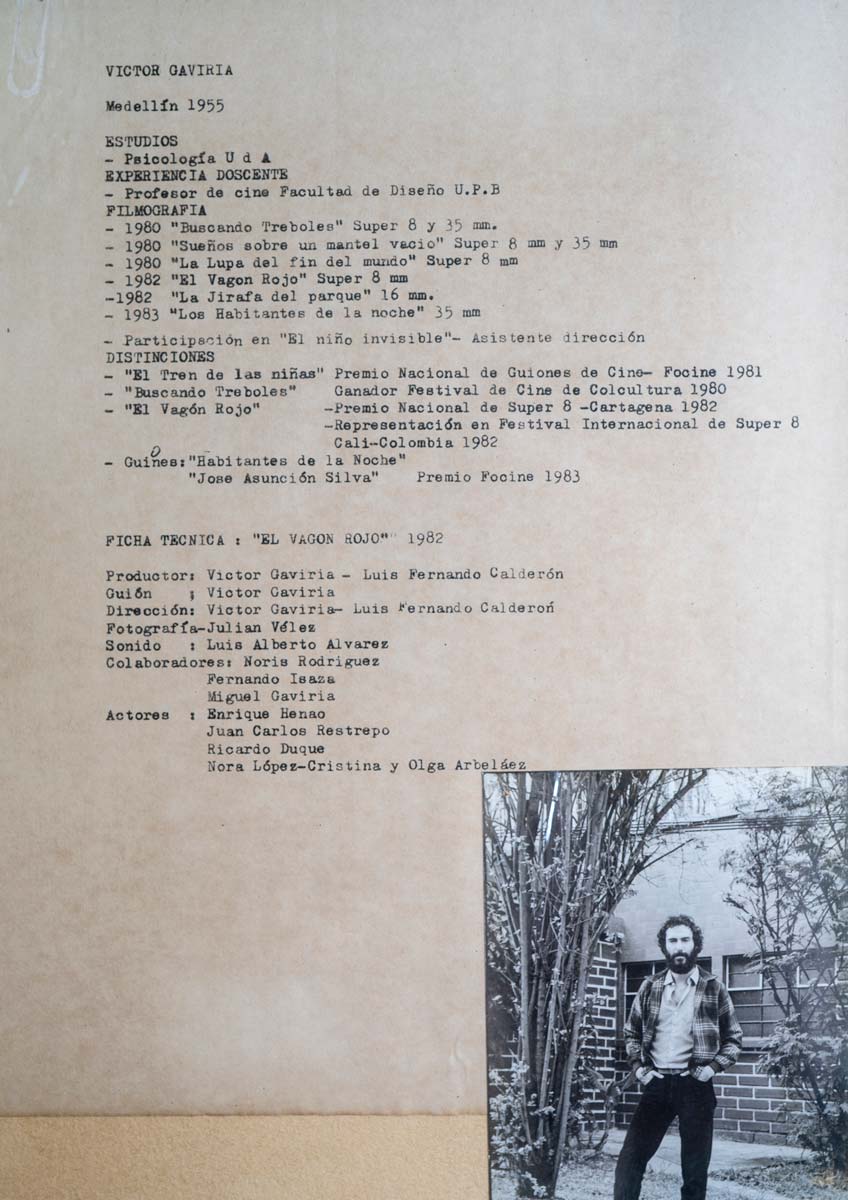 Una tarde de sus 13 años, jugaba fútbol en el parque cuando un grupo de vecinos de su edad llegaron cargando bandejas, joyas y cuchillería de la casa de cada quién. “Víctor vámonos”: se escaparían, irían a probar suerte a la costa. No pudo acompañarlos. Su siguiente película fue sobre ese deseo incompleto de huir. Con algunos de los mismos actores de La lupa y un equipo muy similar, hizo El vagón rojo, sobre un grupo de estudiantes que escapan de clases para ir al desguazadero del Ferrocarril de Antioquia donde sueñan otro lugar, otro mundo.