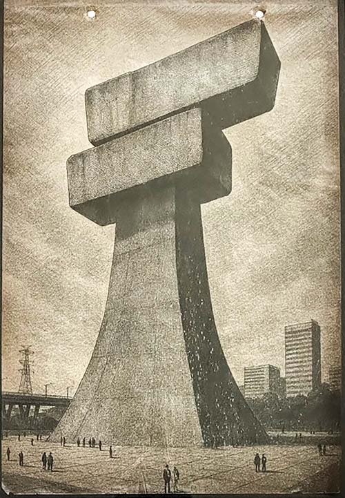 En 1970, el artista Pablo Mora Ortega entregó en la Alcaldía de Medellín un proyecto bajo el título Monumento al pueblo derrotado. Al parecer, el documento aún existe, aunque lo cierto es que no he podido dar con él, completo. Tan solo encontré un atado de hojas amarillentas archivado bajo el código 17B-142/70, en el Archivo Histórico, entre permisos de jardines y luminarias y notas de campo sobre la ciudad. En la primera hoja mecanografiada puede leerse: “Obra conmemorativa de gran escala. Materiales: concreto y piedra. Altura proyectada: 80 metros”. Y en la parte inferior, en tinta negra, la inscripción propuesta: “Al pueblo de Colombia por sus grandes derrotas”.