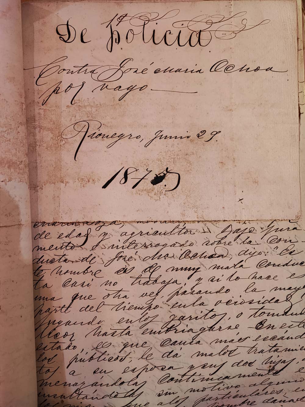 Otro rionegrero acusado de vagancia, pero esta vez anclada en el malentretenimiento, fue José Ochoa, un cincuentón casado con Juliana Vallejo, con quien tenía dos hijas: Rita y Teresa. Ochoa vivía en San Antonio de Pereira donde, a veces, cultivaba la tierra. Sin embargo, daba mala vida a su familia y eran frecuentes sus alborotos y embriaguez. “Este hombre es de muy mala conducta, casi no trabaja y si lo hace es una que otra vez, pasando la mayor parte del tiempo en la ociosidad, jugando en los garitos o tomando licor hasta embriagarse; en este estado es que causa más escándalos públicos. Da malos tratamientos a su esposa y a sus dos hijas, amenazándolas continuamente e insultándolas sin motivo alguno, lo mismo que a los particulares. En pocas palabras, es un hombre dañado y corrompido”, señalaba el agricultor José María Sosa el 30 de junio de 1875.