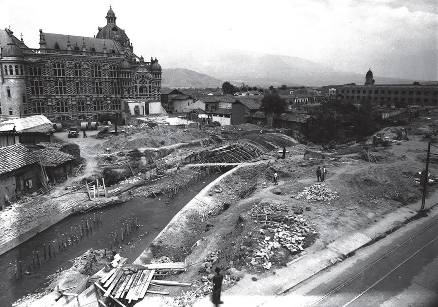 En esta foto lo podemos ver clarito. Ante nuestros ojos —y ante los ojos de quienes miran o conversan dispersos en la escena—, el proceso de enterramiento en todo su esplendor. En medio de la imagen, proyectando su cauce en diagonal desde abajo hacia la derecha, vemos el flujo de agua más importante en el largo proceso de surgimiento, crecimiento y desarrollo de esta ciudad. El que la “amamantó”, la “bautizó” y le dio todo lo que un arroyo —con su lecho y sus riberas— le hubiera podido ofrecer a un pequeño asentamiento humano. Un pequeño caserío en tierras indígenas convertido luego en sitio de españoles y, casi cuatro siglos más tarde —aquí lo vemos—, en un pueblo grande que se negaba a aceptar un apelativo diferente al de “ciudad”: la “Villa de nuestra señora de la Candelaria de Aná”, luego “Villa de nuestra señora de la Candelaria de Medellín”, y hoy Medellín, a secas. Esa que nació recostada a orillas de la antigua quebrada de Aná, la mismísima quebrada Santa Elena. La que desde los días en que fue tomada esta fotografía atraviesa a oscuras el Centro, bajando desde las montañas del oriente hasta desembocar en el río Medellín.