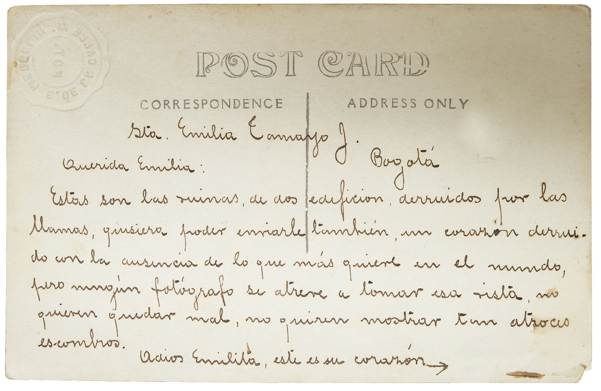 Uno de esos incendios, el de octubre del año 1921, para ser precisos, lo usó un enamorado para enviar a Bogotá las noticias de su propio desastre. “Querida Emilia: Estas son las ruinas de dos edificios, derruidos por las llamas, quisiera poder enviarle también un corazón derruido con la ausencia de lo que más quiere en el mundo, pero ningún fotógrafo se atreve a tomar esa vista, no quieren quedar mal, no quieren mostrar tan atroces escombros. Adiós Emilia, este es su corazón”. Firma al pie de la nota el hombre que, como bien puede leerse, es un alma consumida y agónica entre fuegos de desamores y nostalgias, pero cuya rúbrica intencionalmente omitimos para picar de duda al lector y cubrir con velo de anonimato las astucias de este amante.