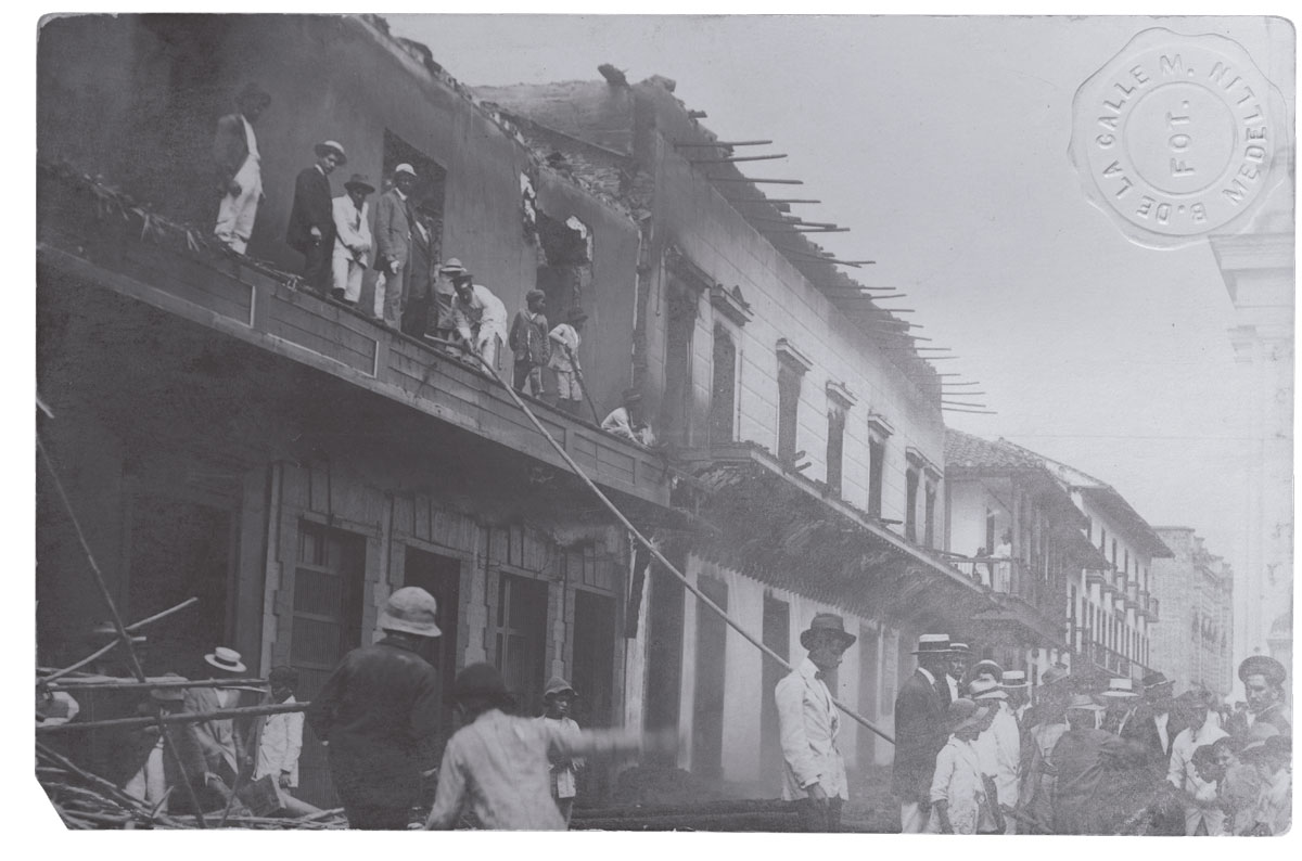 El Parque de Berrío, en Medellín, solía incendiarse con mucha frecuencia. Las lenguas largas de café y aguardiente aún se despachan en hipótesis materialistas y mercantilistas para explicar esa vocación por el fuego de la plaza del comercio principal, que rara sí resulta, pero no viene al caso mencionarlas acá, sobre todo con la boca tan seca y la mente tan sobria. Lo que sí es del caso es que, por la razón que fuera, el Parque de Berrío se quemaba tanto que para los fotógrafos locales se convirtió en una rutina ir a retratar las ruinas. Casi podría hacerse una iconografía: el incendio del 12, el del 16, el del 21, el del 59… quién sabe cuántos más. Total que los escombros humeantes se convirtieron en un motivo fotográfico y no tardó mucho para que los fotógrafos empezaran a vender tarjetas postales como suvenires.