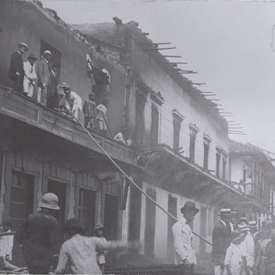 Esta imagen de uno de los incendios del Parque de Berrío hace parte de los elementos identificados en el proyecto Inventario del patrimonio fotográfico mueble en Medellín que realiza la Biblioteca Pública Piloto. Fotografía de Benjamín de la Calle.