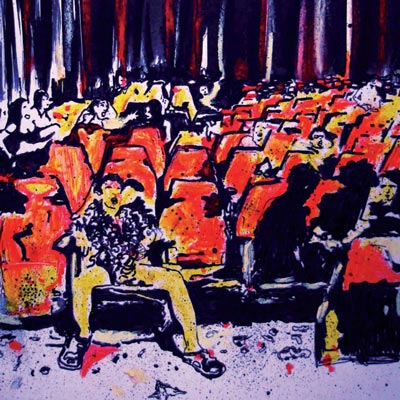 Boleta en mano, paso al siguiente pasillo. Levanto unas pesadas cortinas rojas y me sumerjo en aberraciones y jadeos. A diferencia de los teatros contemporáneos, al Sinfonía se ingresa por la parte superior. Así que me encuentro de frente con una delirante pareja que folla desde la pantalla. Me detengo a ojear el entorno. Desde atrás, veo cabezas desgranadas por las filas. El Sinfonía es un teatro de antaño. En total hay quinientas sillas —un teatro comercial tiene 170-. La sala es enorme. Alrededor hay sujetos de pie, apoyados en las paredes. Con la escasa claridad puedo verlos y todos ellos me clavan la mirada. Lo mejor es seguir adelante.