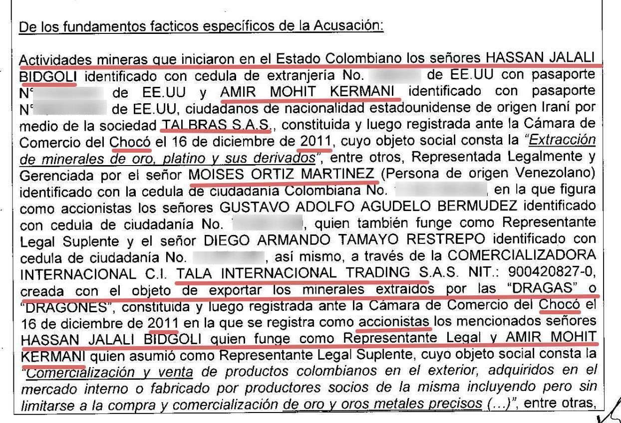 Según el expediente, Moisés Ortiz, exrepresentante legal de esta última empresa, integró una organización criminal que extrajo oro sin títulos mineros ni licencias ambientales en los municipios de Río Quito y Medio San Juan, en Chocó. La red explotaba una desembocadura del río Atrato el 5 de diciembre de 2018, cuando un juez emitió 13 órdenes de captura que incluyeron a Jalali Bidgoli y Mohit-Kermani.